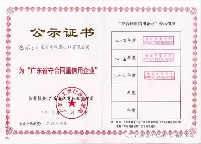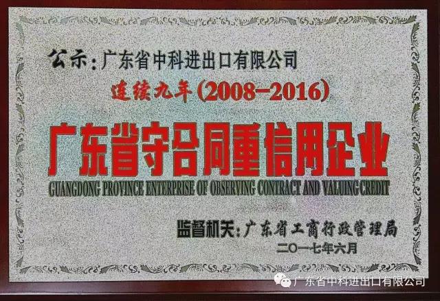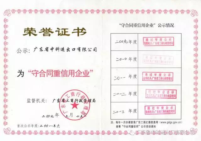 我司繼2008年首次申請(qǐng)并獲得“廣東省守合同重信用企業(yè)”稱(chēng)號(hào)以來(lái),至2016年度已連續(xù)九年獲得此榮譽(yù)稱(chēng)號(hào)。這是工商部門(mén)對(duì)我司的認(rèn)可,更是廣大客戶對(duì)我司的認(rèn)可。