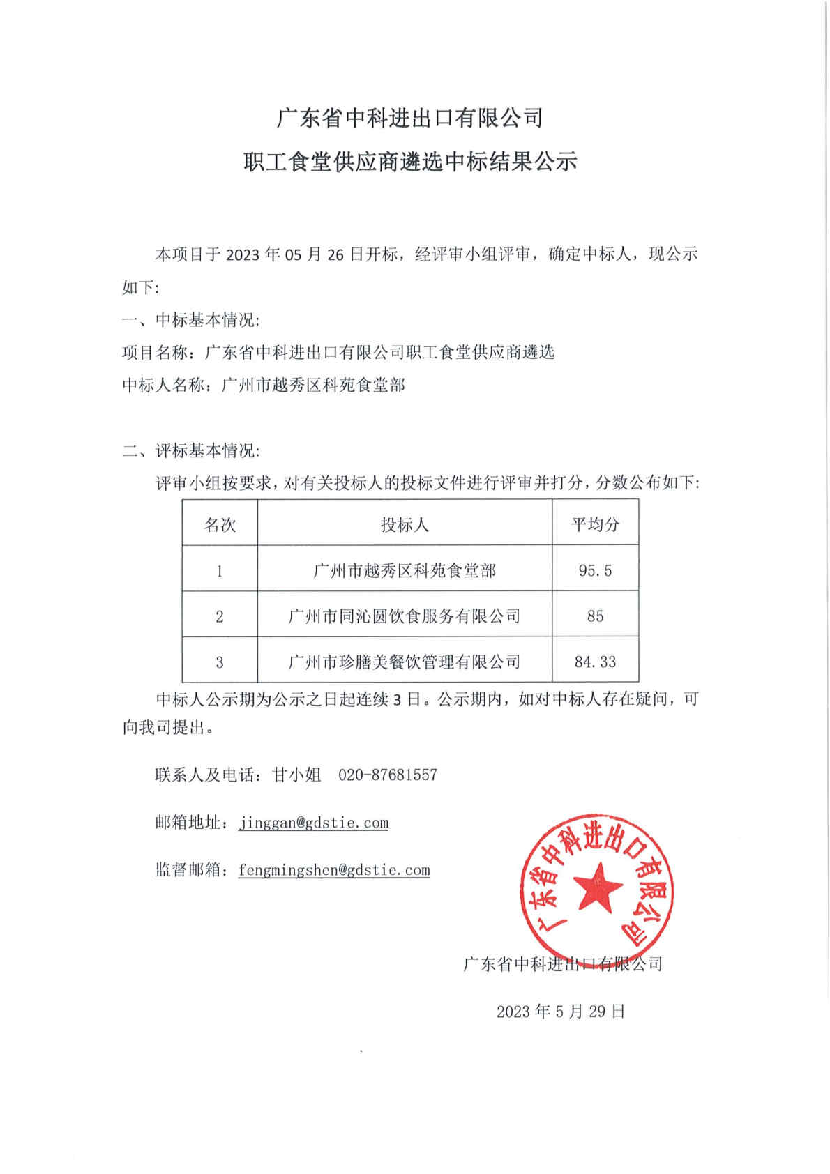 廣東省中科進(jìn)出口有限公司職工食堂供應(yīng)商遴選中標(biāo)結(jié)果公示